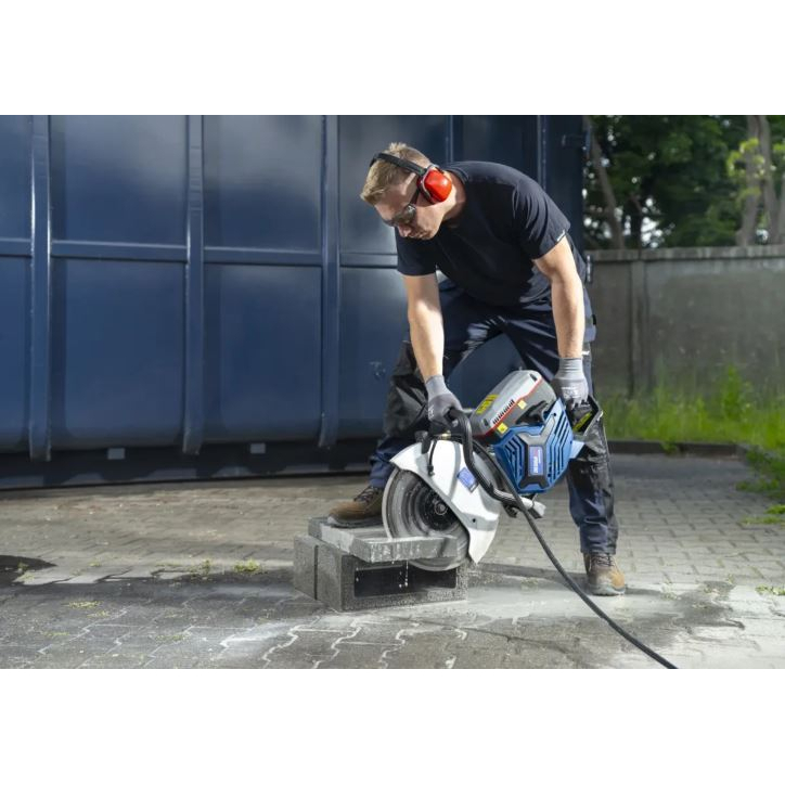 Vienas iš papildomų pjoviklio privalumų – vandens aušinimo sistema, kuri veiksmingai sumažina dulkių susidarymą darbo metu. Šis sprendimas žymiai pagerina operatoriaus komfortą ir saugumą, sumažindamas ore tvyrančių dulkių kiekį. Be to, reguliuojamas disko gaubtas apsaugo nuo atplaišų, dar labiau padidindamas darbo saugumą.