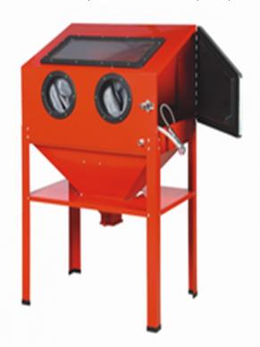 sealed cabinet with lid and viewing window, mounted gloves and cabinet air filters, to prevent the escape of abrasive material
